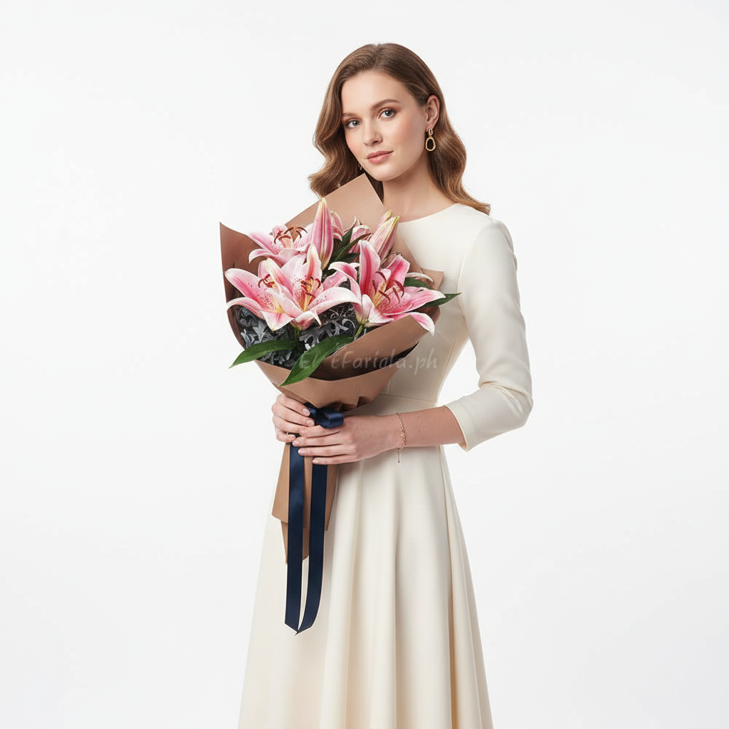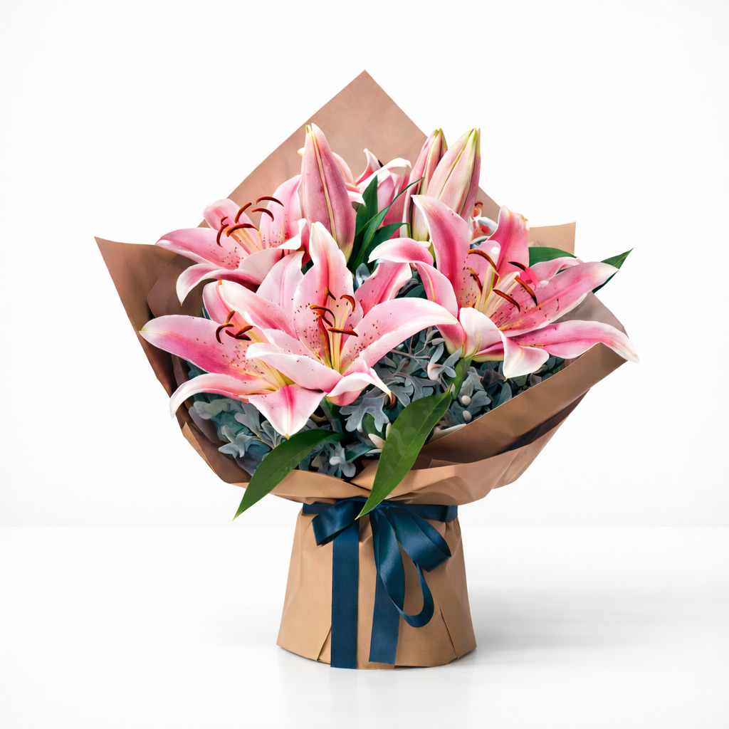 باقة زنابق وردية أنيقة، رقيقة، وعطرة، وغنية بالمعاني، تُعبّر هذه الباقة الرائعة عن الحب والإعجاب والجمال. تتميز بزنابق وردية ناعمة ، تُبرز كل زهرة بتلاتها الرقيقة ورائحة الأزهار العطرة. تُزيّن الباقة بأوراق خضراء نضرة تُضفي عليها سحرًا طبيعيًا، وتُغلّف بورق كرافت بني فاخر ، مما يمنحها مظهرًا كلاسيكيًا راقيًا.