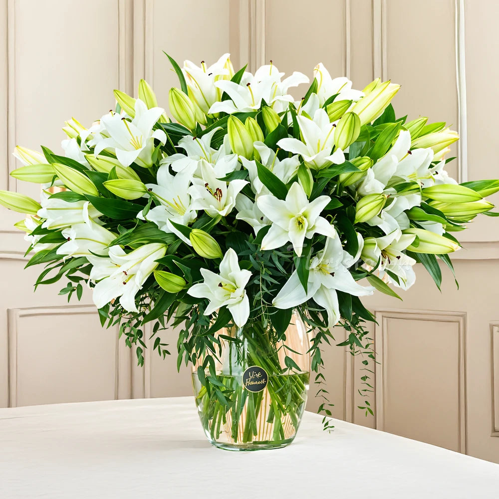 This luxurious bouquet features 12 high-quality white lilies, known for their exquisite fragrance and elegance. Wrapped in beautiful premium paper, this stunning arrangement is perfect for expressing admiration, peace, and pure affection on any special occasion.