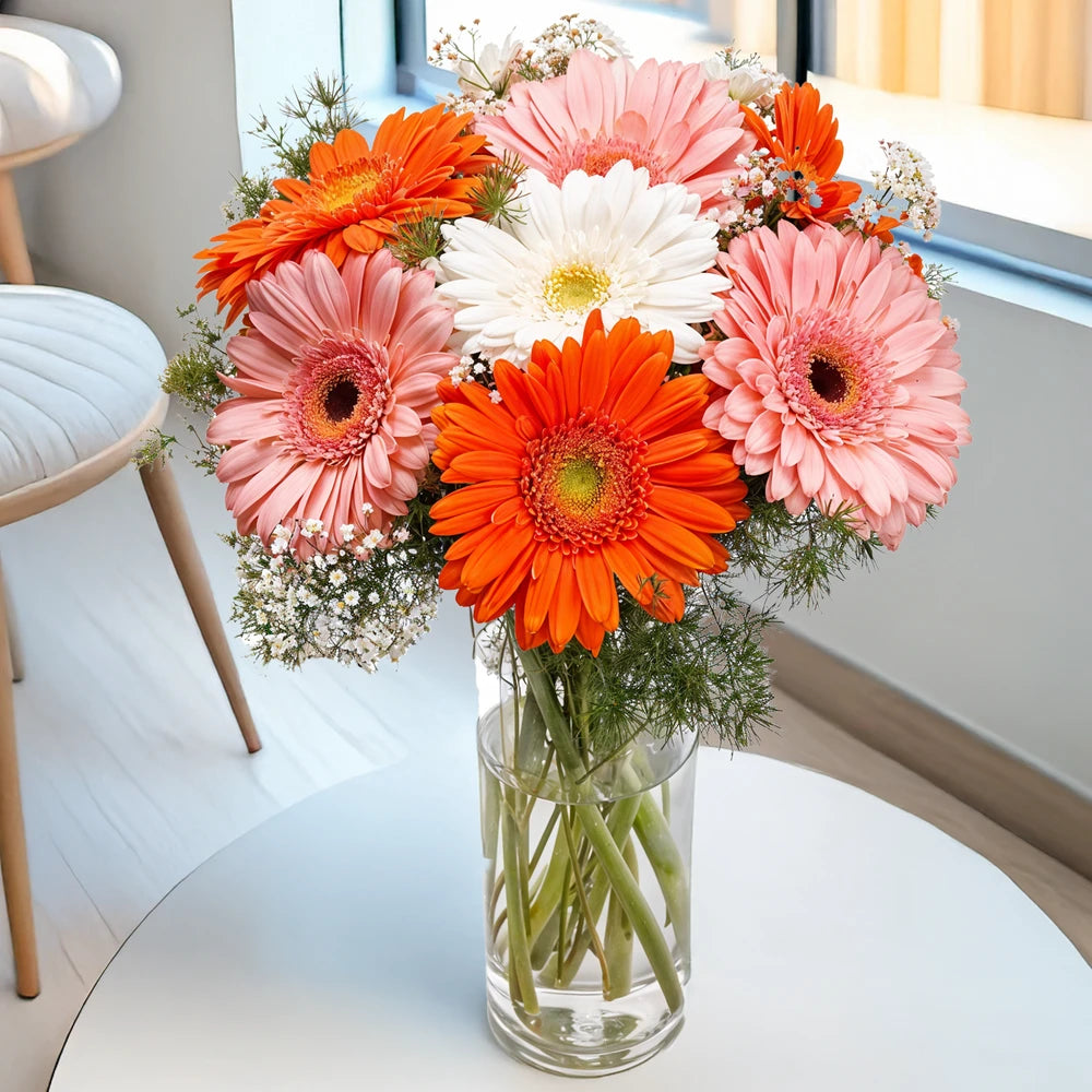 This vibrant glass vase features 3 white gerberas, 3 pink gerberas, and 3 orange gerberas, bringing together a burst of color and joy. The lively mix of gerberas symbolizes happiness, optimism, and new beginnings, making this bouquet the perfect gift to brighten anyone’s day.